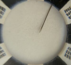 見難いですが、太さ長さも正常で毛根鞘(白い皮膚)が付いている正常な抜け毛です。