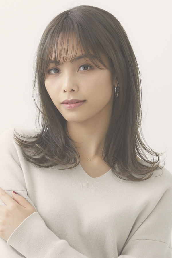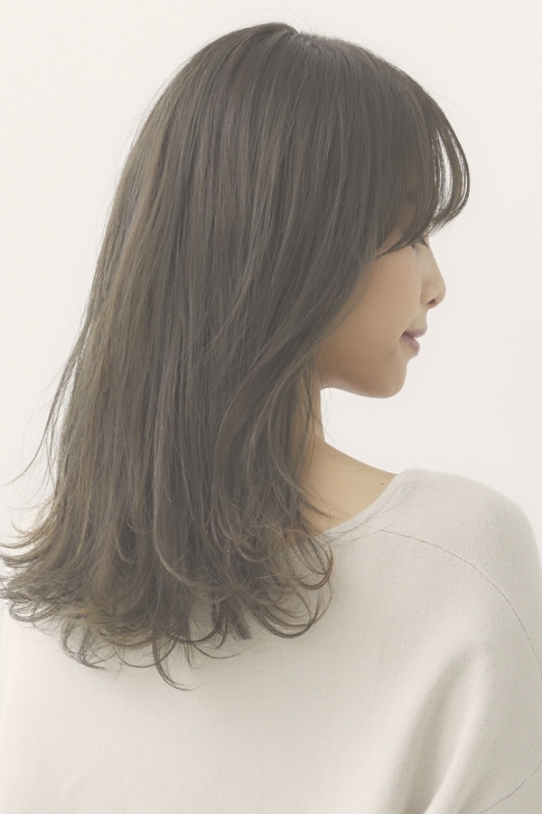 肩に沿って綺麗に流れるミディアム。前髪はシースルーにして目力アップの今期イチオシスタイル。カラーは赤味を除去して大人のを上げるアッシュグレイに。