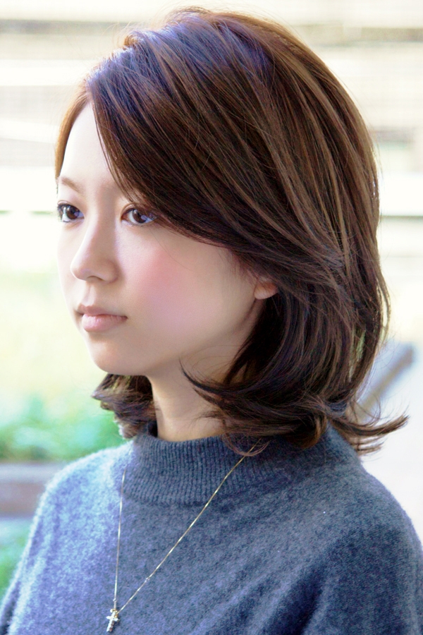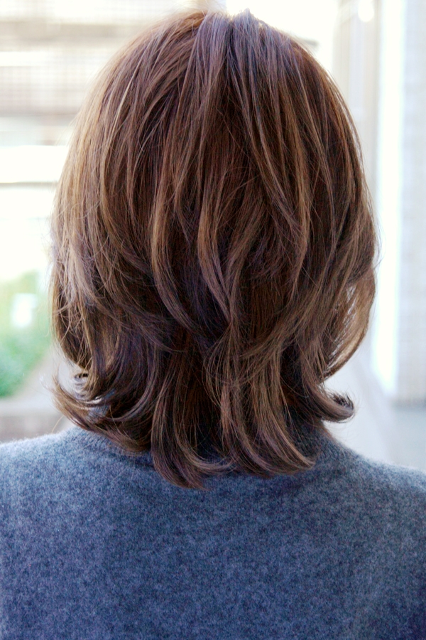 自然なボリュームが出る位置でレイヤーを入れ、毛先にワンカールでパーマをかけています。毛先のカールの動きとツヤ感のバランスをうまくとることで、上品な雰囲気が出ます。カラーはローライトを入れることで、ツヤ感をキープしながら、立体感を演出しています。